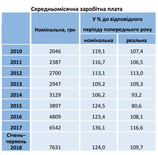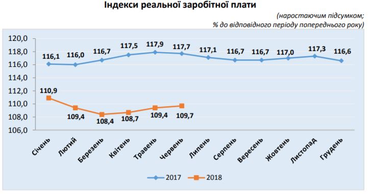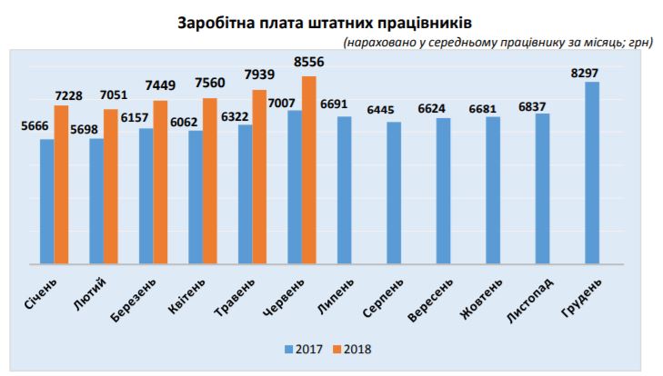 Так, среднемесячная зарплата за январь-июнь составила 7631 грн. В июне 2018 года относительно июня 2017 средняя