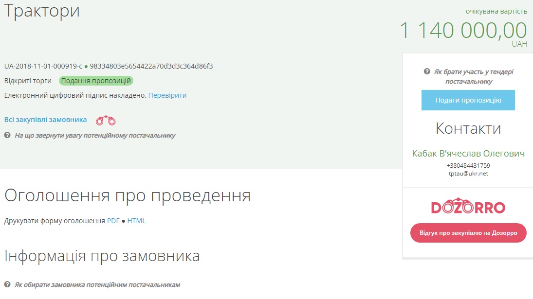 Государственное учебное заведение «Татарбунарское профессионально-техническое аграрное училище» объявило тендер для покупки двух тракторов на общую сумму 1 миллион 140 тысяч гривень.