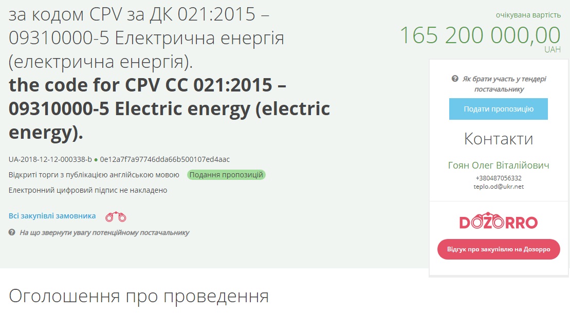 Согласно объявлению, КП заплатит 165 миллионов 200 тысяч гривень за 70 миллионов кВт/ч в течение 2019 года.