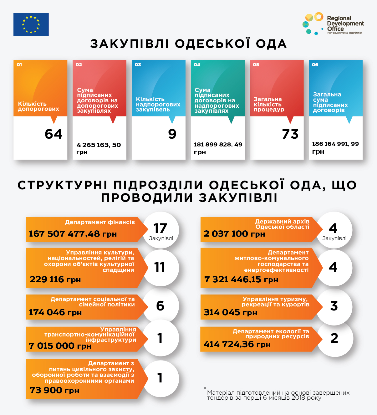 Аналитики общественной организации «Офис Регионального Развития» обобщили результаты публичных закупок, которые проводились Одесской облгосадминистрацией и райгосадминистрациями Одесской области в течение первого полугодия 2018 года.