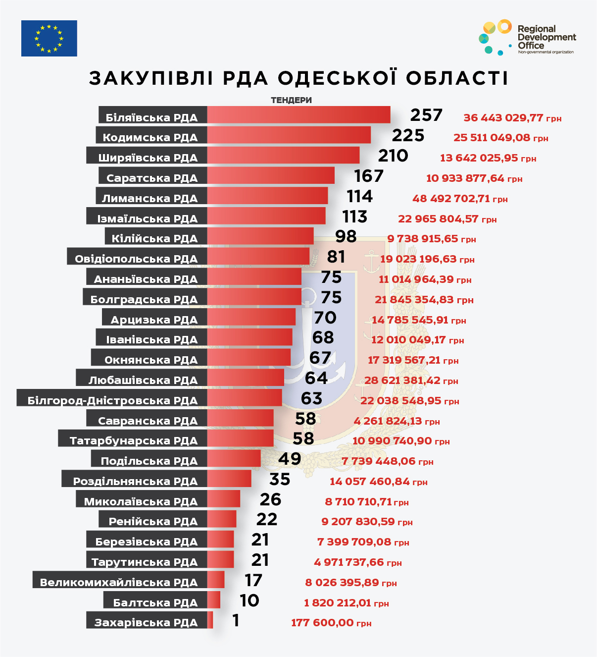 Правда по общей сумме закупок лидирует не она, а Лиманская РГА, замыкающая пятерку лидеров. Общая сумма по 114 закупкам Лиманской РГА — 48 миллионов 492,7 тысячи гривень. Второе место в лидерах по количеству закупок занимает Кодымская РГА 225 закупок, третье Ширяевская РГА — 210 закупок и четвертое Саратская РГА — 167 закупок.