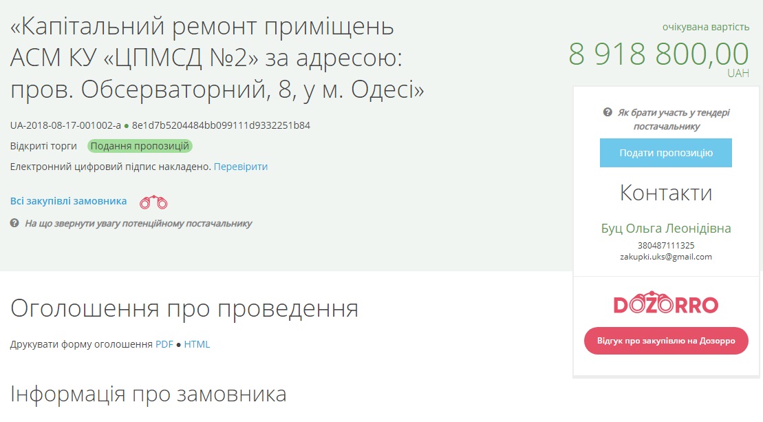 Управление капитального строительства Одесского горсовета объявило тендер для поиска компании, которой заплатят за капитальный ремонт помещений центра медико-санитарной помощи №2.