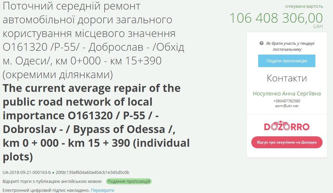 Служба автомобильных дорог Украины объявила тендер для поиска подрядчика, которому заплатят за текущий ремонт автомобильной дороги общего пользования местного значения Р-55 - Доброслав - Обход Одессы.