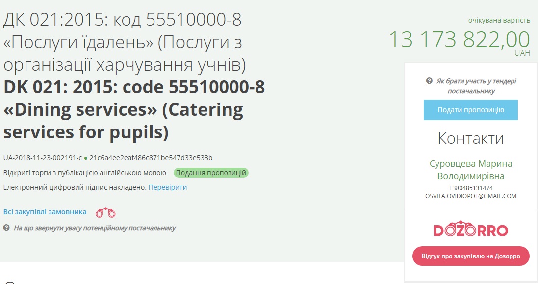 По данным системы речь идет о 16 школах в том числе в самом Овидиополе. Ожидаемая стоимость закупки 13 миллионов 173 тысячи 822 гривни.