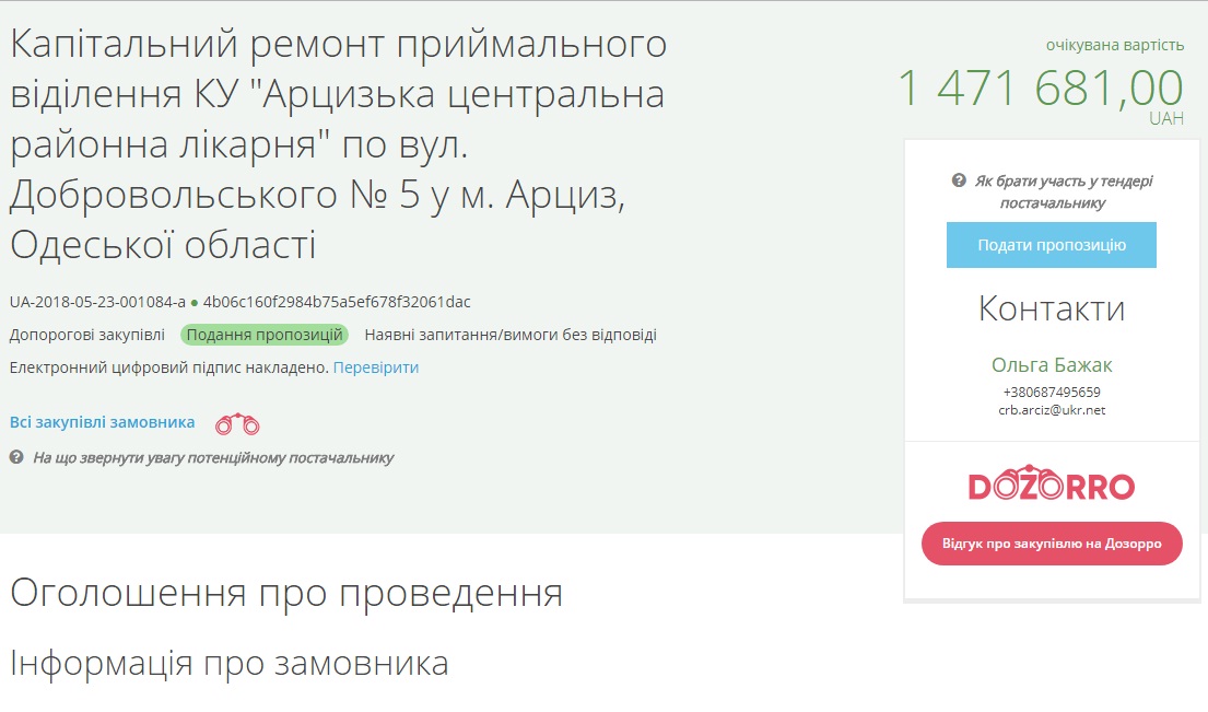 Коммунальное учреждение «Арцизская центральная районная больница» объявила тендер для выбора компании, которой заплатит за капитальный ремонт здания.