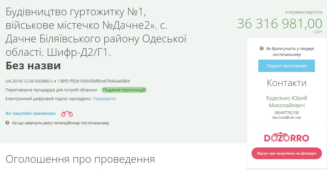 Южное территориальное квартирно-эксплуатационное управление объявило тендер для поиска подрядчика, которому заплатят за строительство общежития №1, в военном городке Дачное-2 в селе Дачном Беляевского района Одесской области.