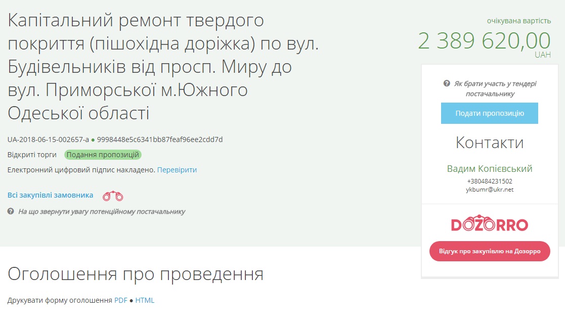 Об этом сообщили в системе электронных закупок Рrozorro.