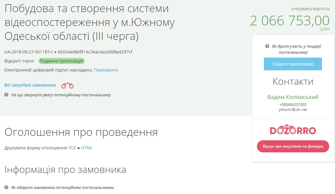 Управления капитального строительства Южненского городского совета проведет аукцион для выбора подрядчика, которому заплатят за оборудование системы видеонаблюдения в Южном.