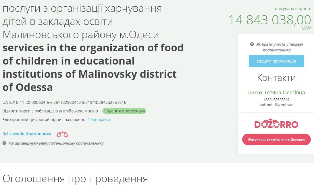 Соответствующие данные опубликованы в системе электронных закупок Рrozorro.