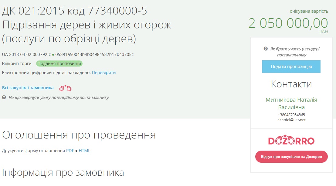 За работу департамент предлагает 2 миллиона 50 тысяч гривень. Подрезать планируется 1 тысячу 259 деревьев. То есть, средняя цена подрезки одного дерева — 1,6 тысяч гривень.