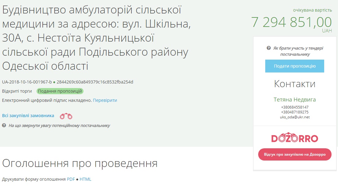 По данным системы, речь идет о строительстве амбулатории в селе Нестоита Куяльницкого сельского совета.