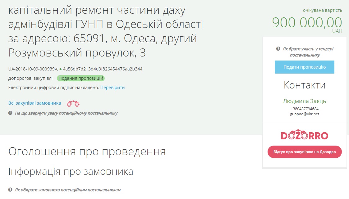 Главное управление Национальной полиции Украины объявило тендер для поиска подрядчика, которому заплатят за капитальный ремонт части крыши админздания ГУНП по Одесса, второй Разумовский переулок, 3.
