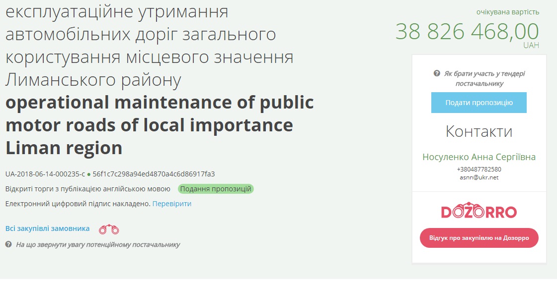 Об этом сообщается в системе электронных закупок Рrozorro.