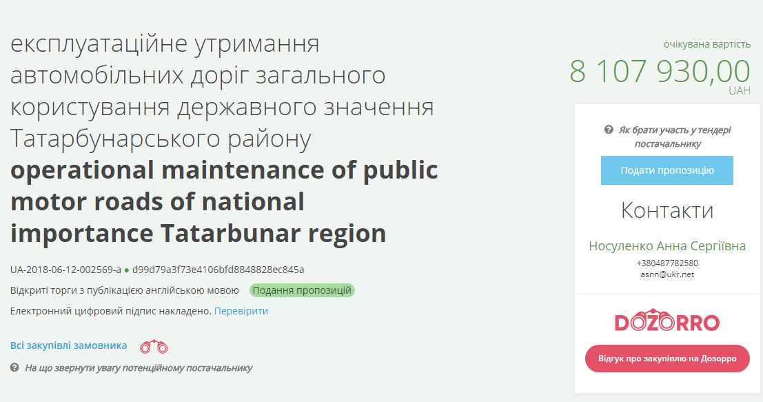 Служба автомобильных дорог в Одесской области объявила тендер для поиска компании, которой заплатят за эксплуатационное содержание автомобильных дорог общего пользования государственного значения Татарбунарского района.