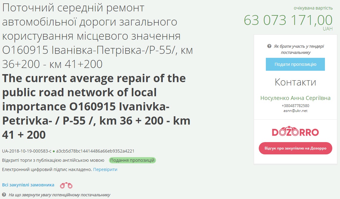 Речь идет о ремонте пяти километров дороги с ожидаемой стоимостью закупки в 63 миллиона 73 тысячи 171гривню. Аукцион состоится 26 декабря, а закончить ремонт планируется до 31 января 2019 года.