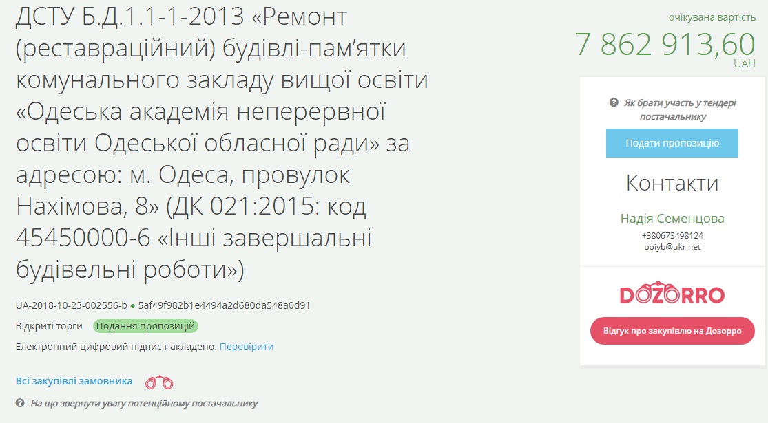 Коммунальное учреждение высшего образования «Одесская академия непрерывного образования Одесского областного совета» ищет подрядчика для реставрации здания-памятника.