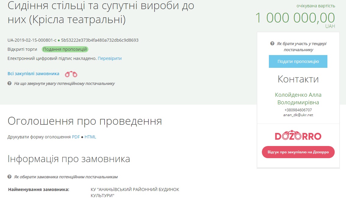Всего учреждение купит 429 театральных кресел, а ожидаемая стоимость закупки — один миллион гривень.