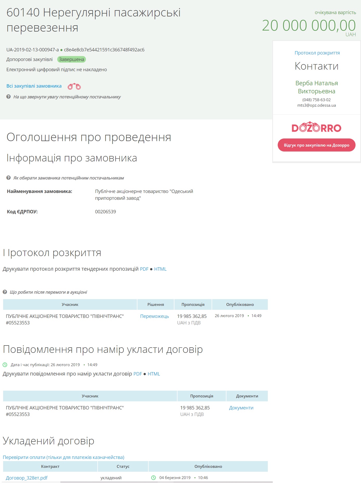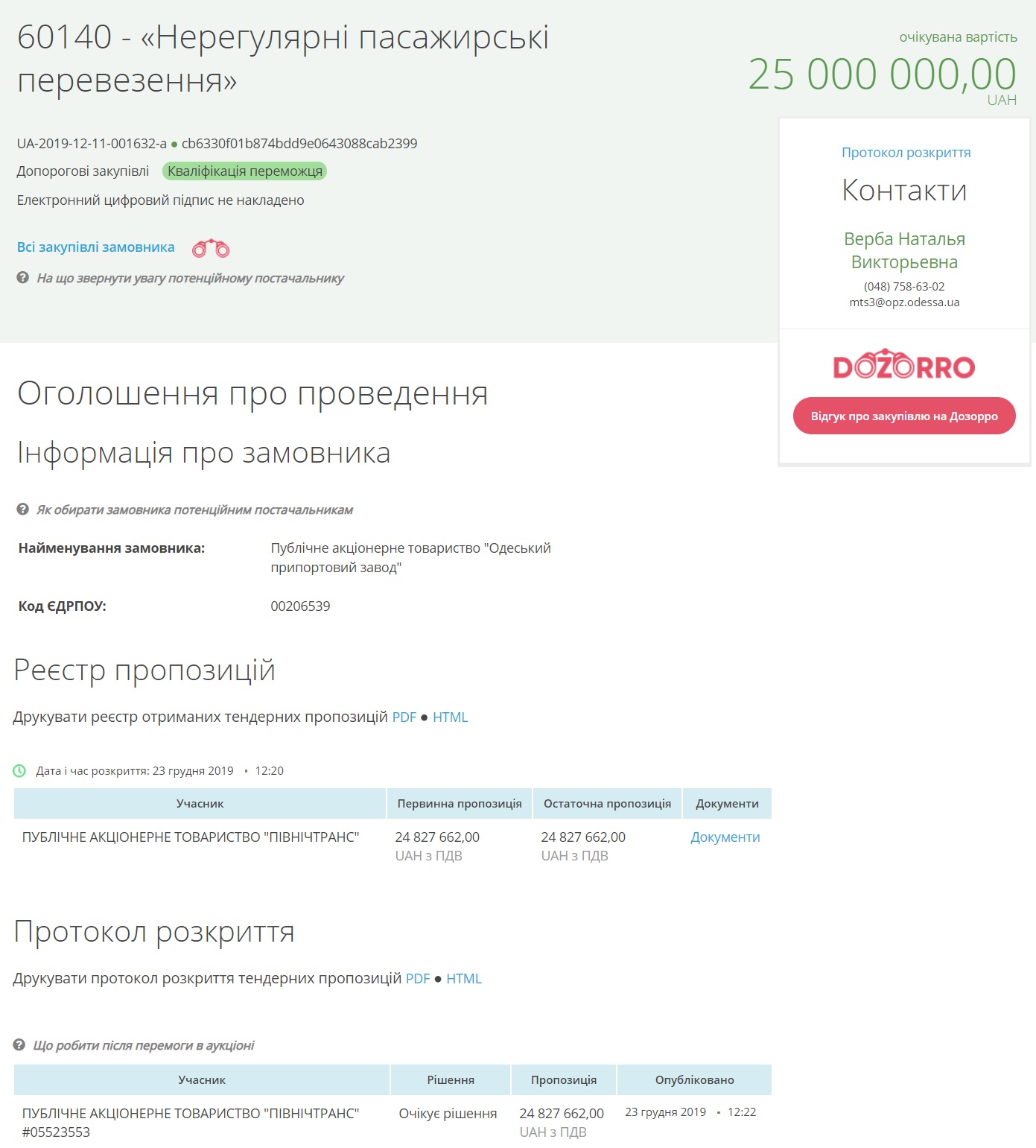 Компания согласилась в 2020 году возить сотрудников из города Южного на завод, а также по маршруту Одесса-Южный-Одесса за 24 миллиона 827,6 тысяч гривень при ожидаемой стоимость закупки — 25 миллионов гривень.