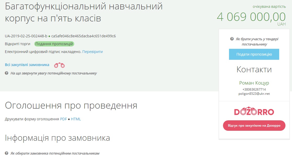 По данным системы, аукцион состоится 15 марта. Ожидаемая стоимость закупки — 4 миллиона 69 тысяч гривень. Строительство должно закончиться до 31 июля 2019 года.