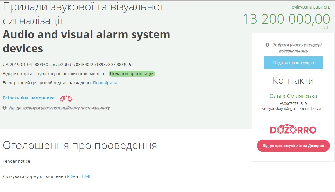 Управление полиции охраны в Одесской области объявило тендер для выбора компаний, у которых купит приборы звуковой и визуальной сигнализации.