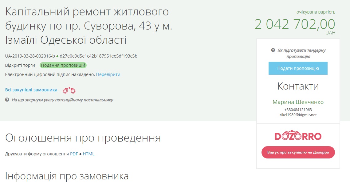 Управление жилищно-коммунального хозяйства Измаильского городского совета в Одесской области объявило тендер для выбора подрядчика, которому заплатят за ремонт дома №43 на проспекте Суворова.
