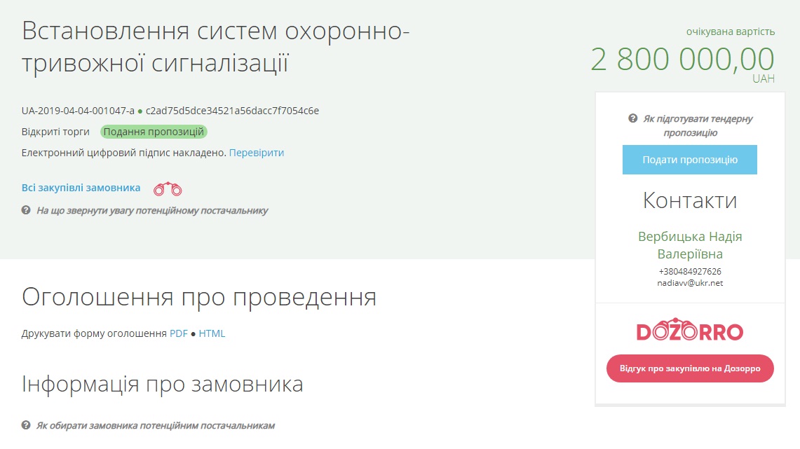 По данным системы, ожидаемая стоимость закупки — 2 миллиона 800 тысяч гривень. Аукцион состоится 22 апреля, а завершить установку сигнализации в колах следует до 1 июня 2019 года.