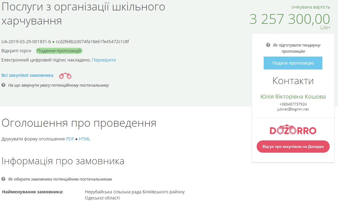Нерубайский сельский совет Беляевского района Одесской области объявил тендер для выбора компании, которой заплатят за организацию питания для школьников.