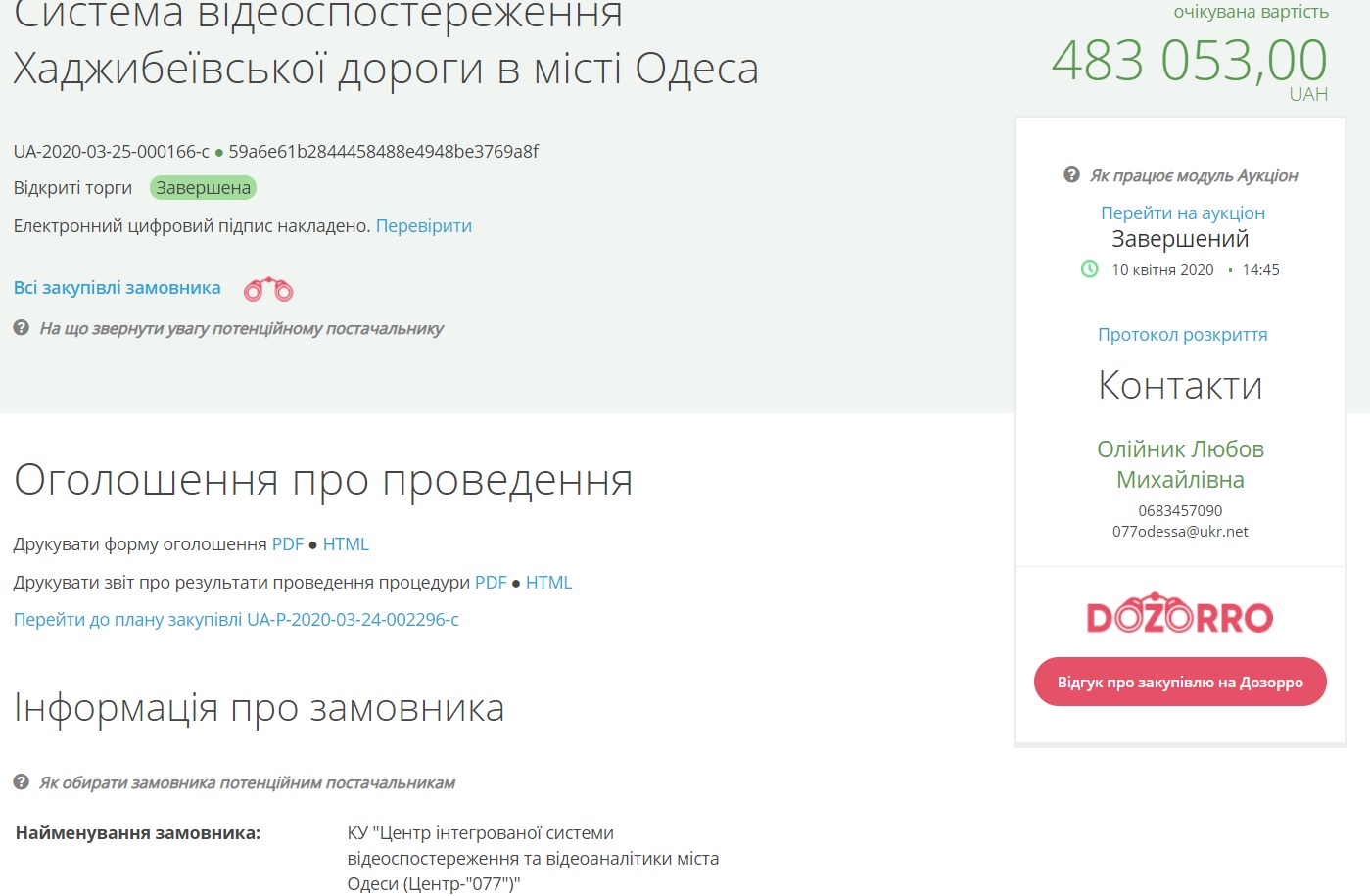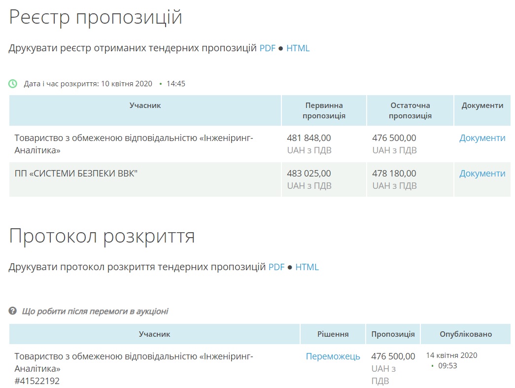 По данным системы, аукцион состоялся 10 апреля, и, кроме победителя, в нем участвовало частное предприятие «Системы безопасности ВВК». Однако предложение конкурента на втором шаге аукциона оказалось почти на две тысячи гривень дороже.