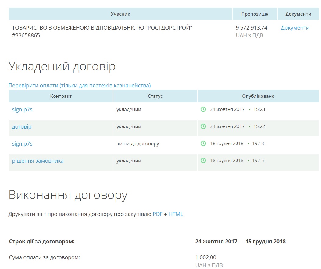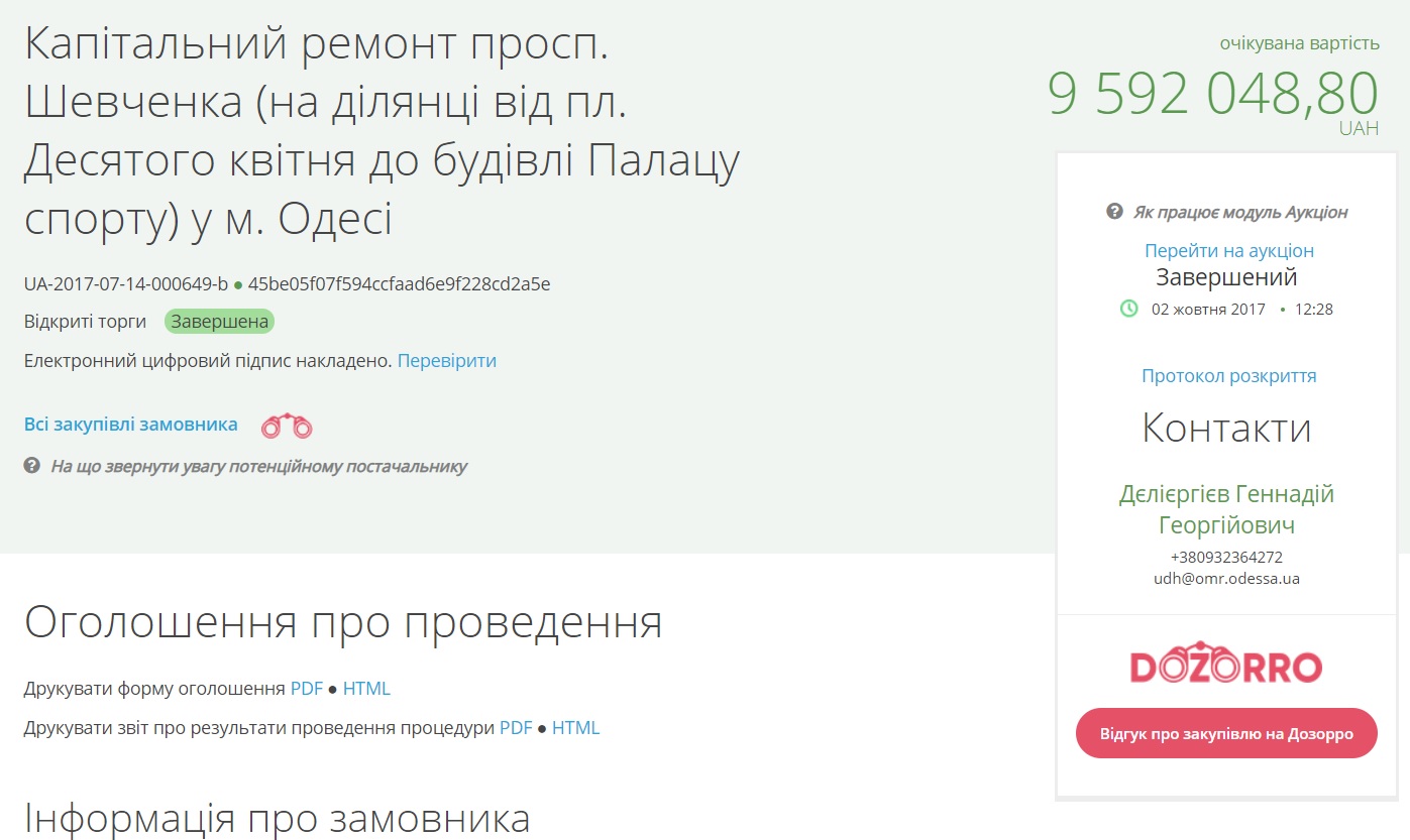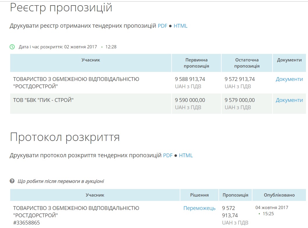 В 2017 году управление дорожного хозяйства горсовета провело тендер для выбора подрядчика, которому планировали заплатить более девяти миллионов за работы на этом участке. Тогда победителем стало ООО «Ростдорстрой», согласившееся работать за 9 миллионов 572 тысячи гривень. Конкурентом было ООО «СПК «Пик-строй»».