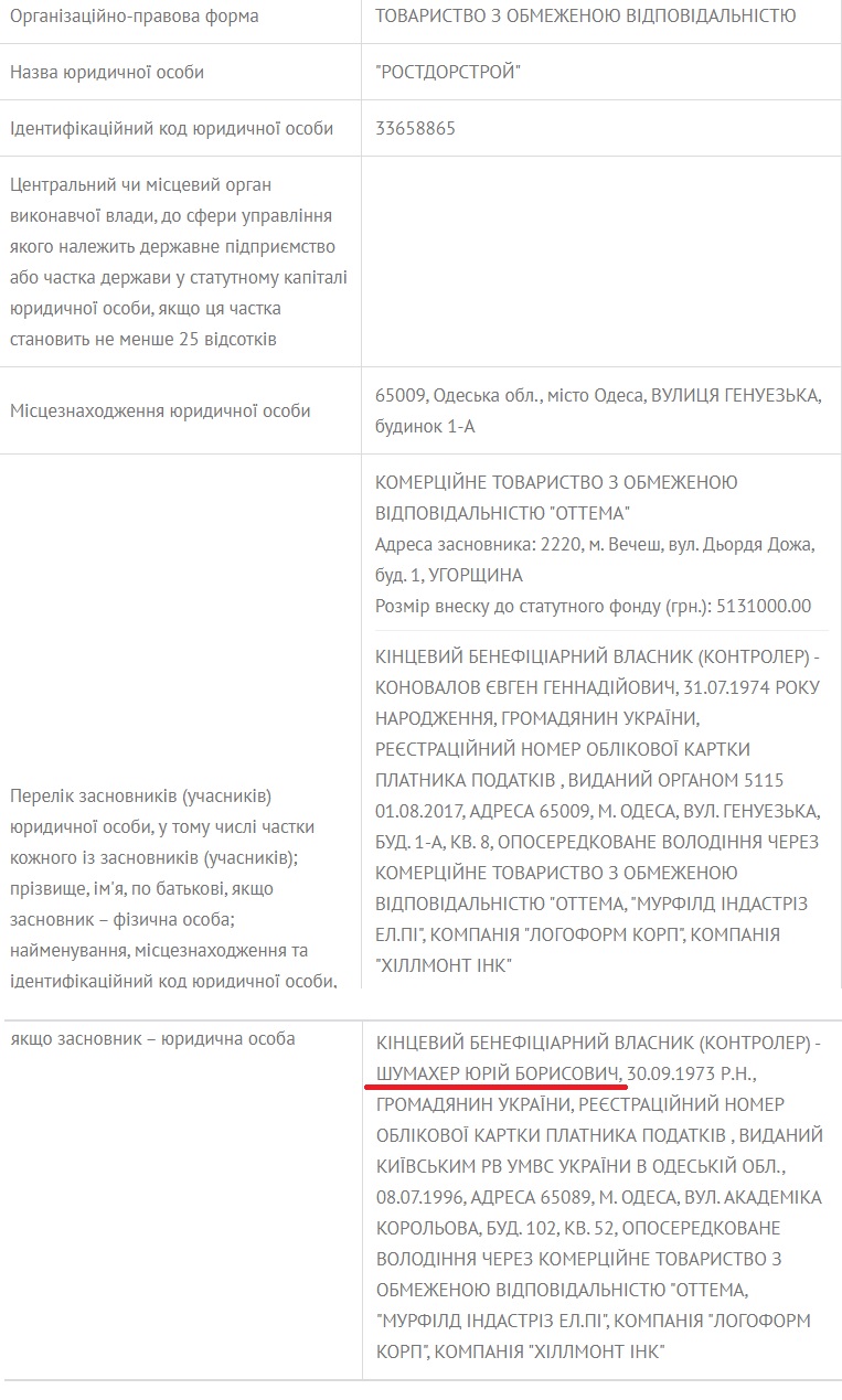 Отметим, что обе компании принадлежат депутата Одесского городского совета. Совладельцем ООО «Ростдорстрой» является депутат Юрий Шумахер, представитель партии «Доверяй делам» Одесского городского головы Геннадия Труханова, а ООО «СПК «Пик-строй»» Марина Лозовенко, представитель той же партии.