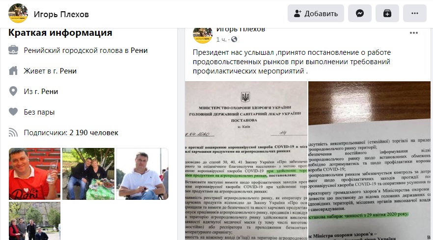 Позже Игорь Плехов разместил на своей страничке в Facebook следующее сообщение: «Президент нас услышал, принято постановление о работе продовольственных рынков при выполнении требований профилактических мероприятий».
