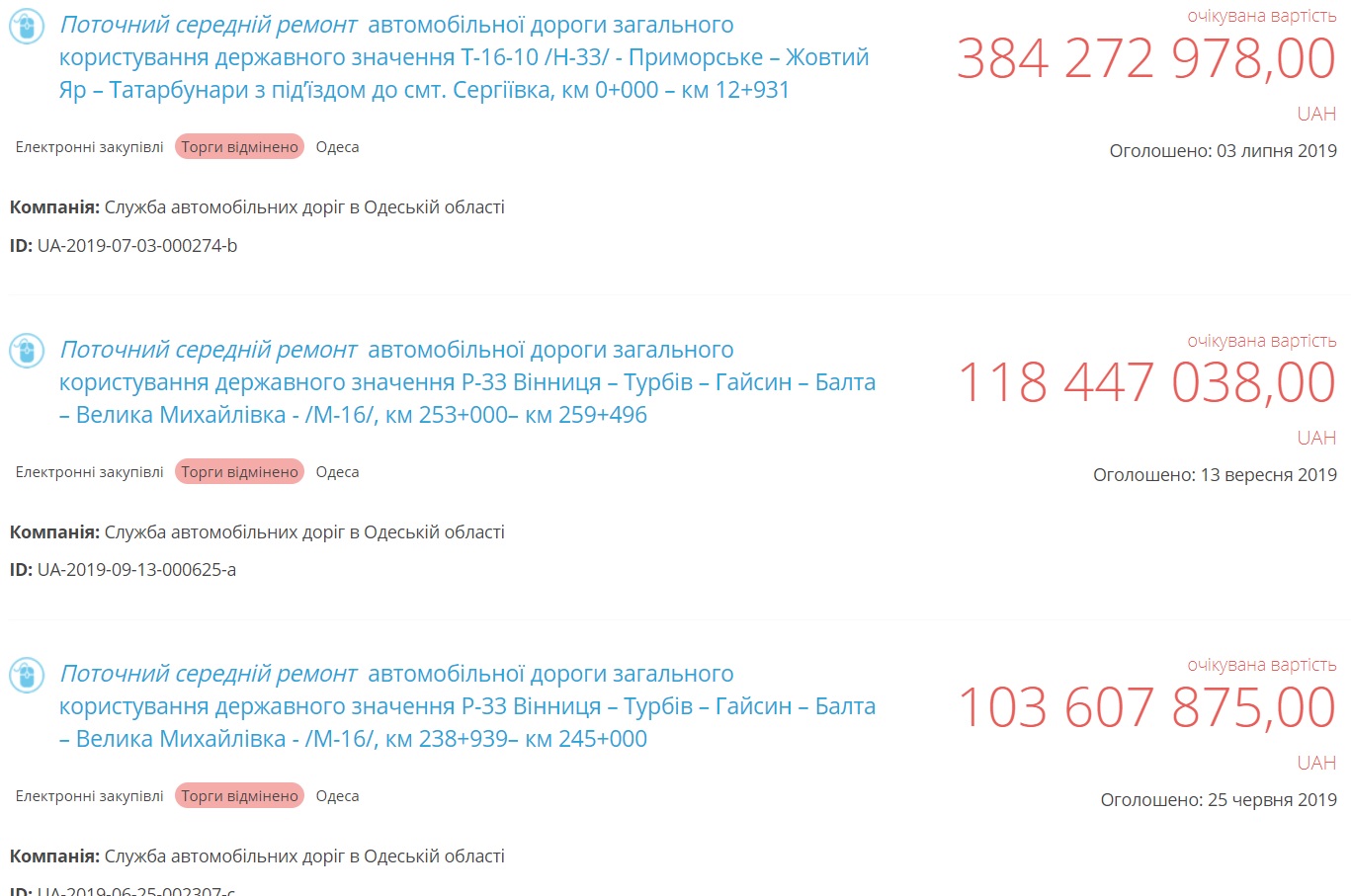 В частности, отменили аукцион для поиска подрядчика, которому предполагалось заплатить за текущий средний ремонт автомобильной дороги общего пользования государственного значения Т-16-10/Н-33/ - Приморское - Желтый Яр - Татарбунары подъезд к Сергеевке с ожидаемой стоимостью закупки в 384 миллиона 272,9 тысячи гривень. К аукциону допустили ООО «Ростдорстрой» и ООО «Автомагистраль-Юг».