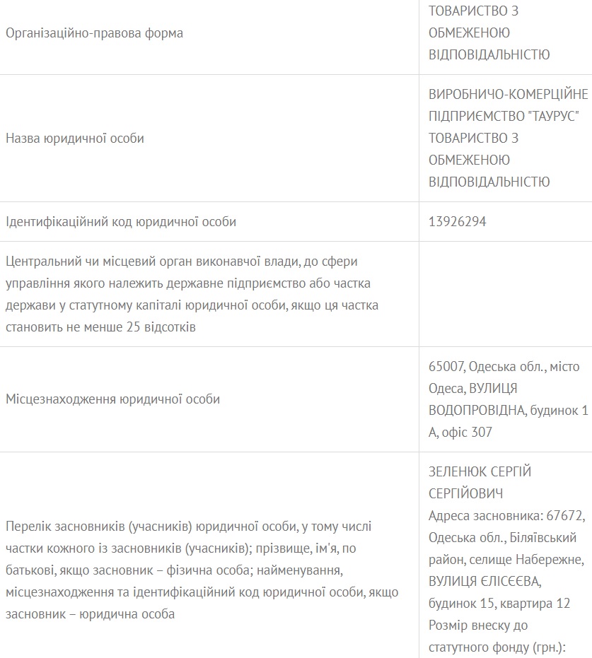 Согласно единому реестру юридических лиц, физических лиц-предпринимателей и общественных формирований, владельцем и директором ООО «Таурус» является Сергей Зеленюк.