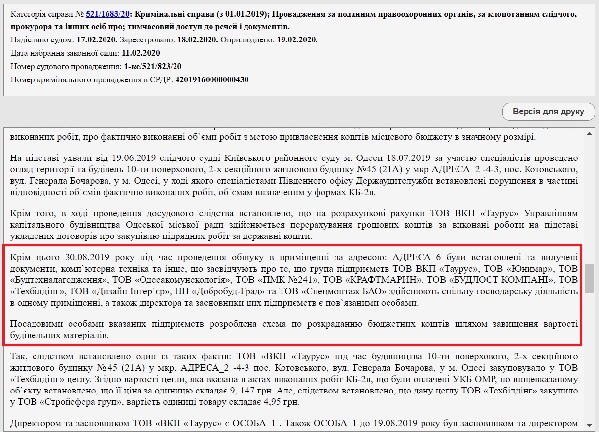 Более того, 30 августа 2019 года при проведении обыска были изъяты документы, компьютерная техника и другие вещи, свидетельствующие о том, что группа компаний ООО ПКП «Таурус», ООО «Юнимар», ООО «Будтехналагодження» ООО «Одессакоммунэкология», ООО «ПМК №241», ООО «Крафтмарин», ООО «Будлост Компани», ООО «Техбилдинг», ООО «Дизайн Интерьер», ООО «Добробуд-Град» и ООО «Спецмонтаж БАО» осуществляют совместную хозяйственную деятельность в одном помещении, а директора и учредители этих предприятий связаны между собой.