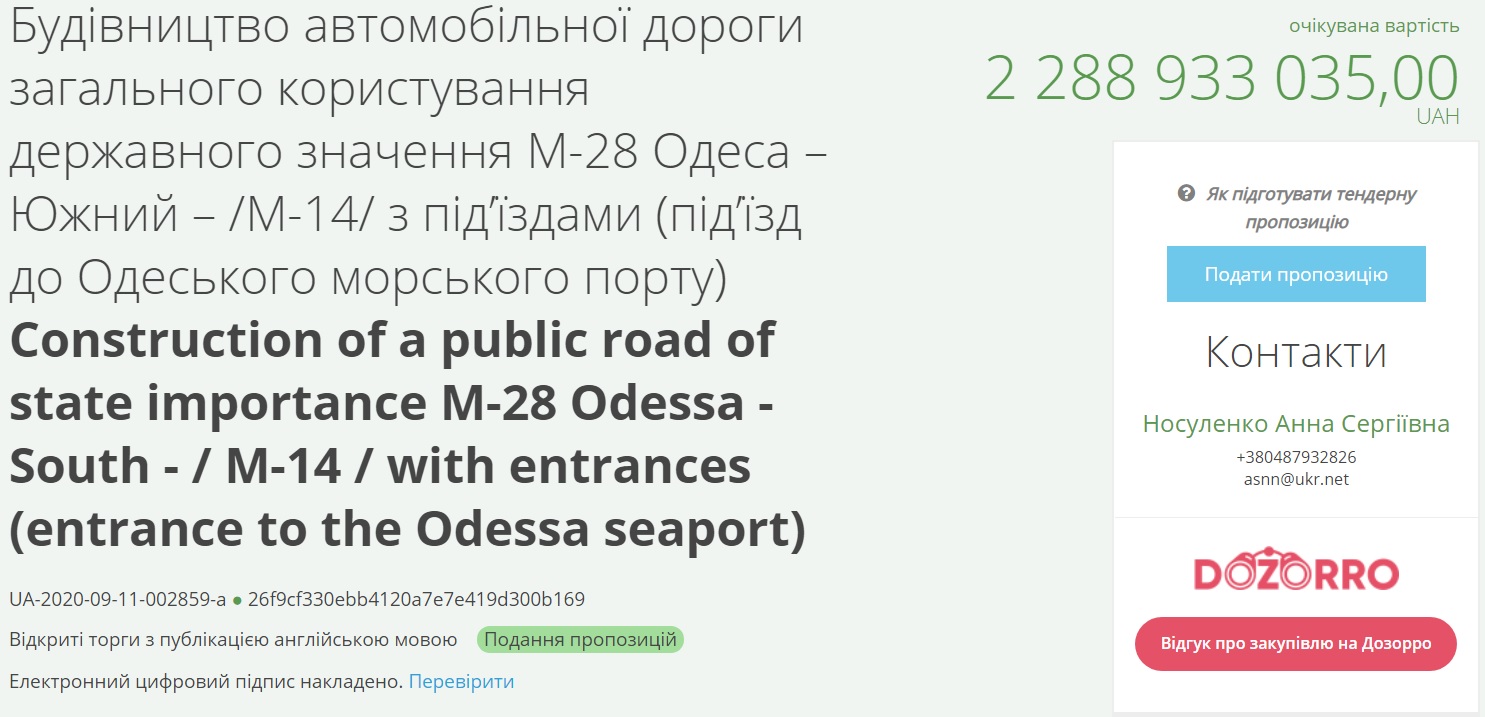 По данным системы, аукцион с ожидаемой стоимостью закупки в 2 миллиарда 288 миллионов 933 тысячи гривень состоится 17 ноября 2020 года, а завершение работы планируется до 31 декабря 2022 года.