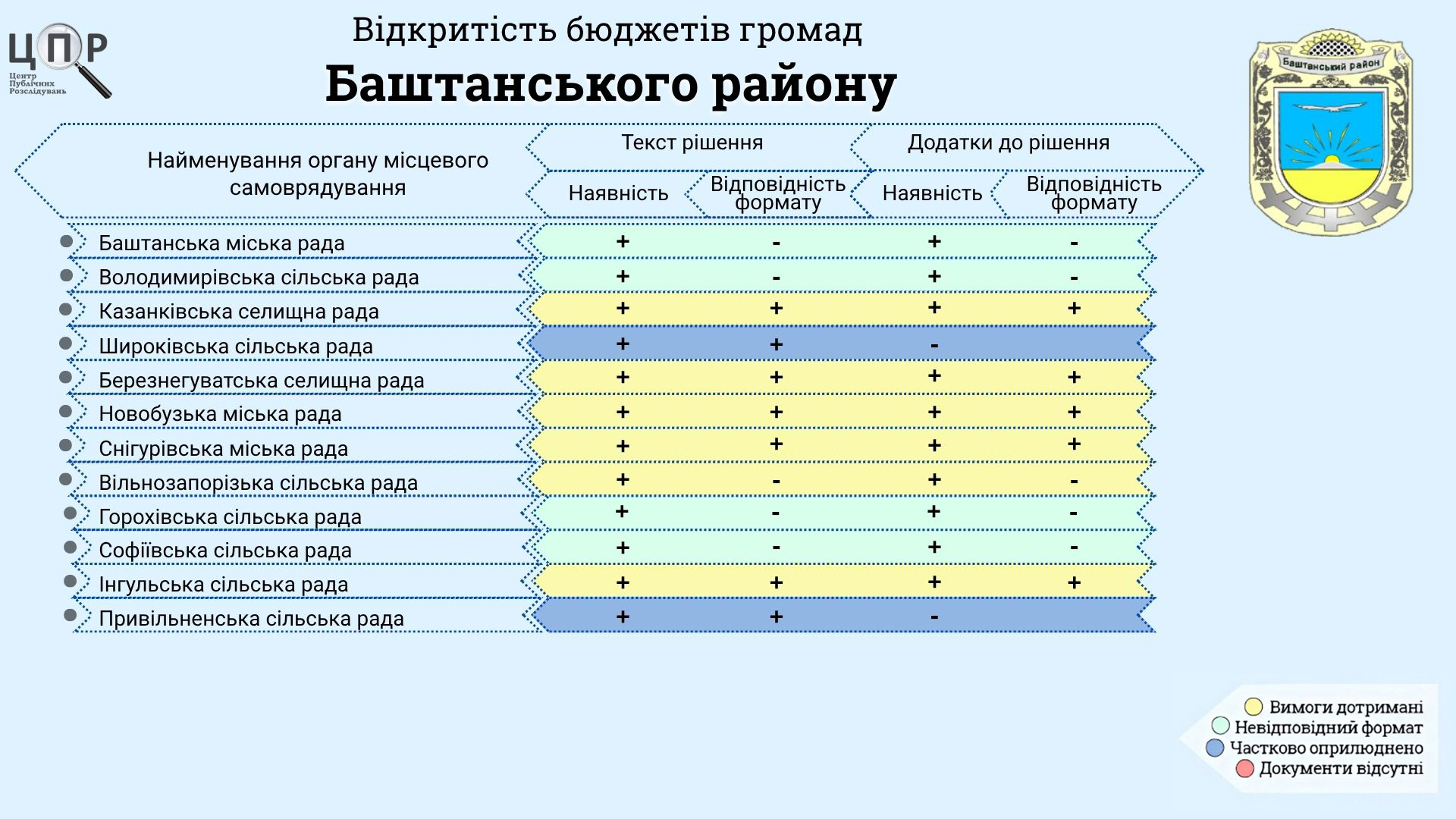 Несмотря на успехи лидеров, часть советов Баштанского района демонстрирует низкий уровень прозрачности. В число менее открытых вошли Баштанский, Владимировский, Гороховский и Софиевский советы. Хотя решения о бюджетах на их сайтах и обнародованы, они представлены преимущественно в формате PDF, что прямо нарушает требования законодательства об открытых данных. Кроме того, неудобная навигация усложняет поиск документов.