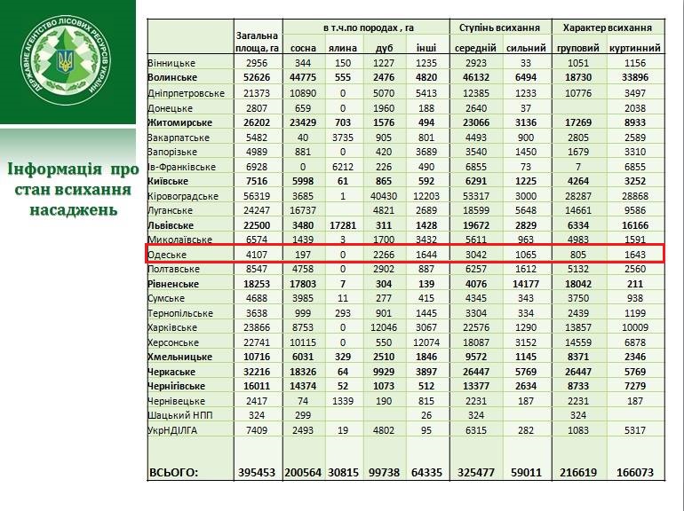 В Одесской области сильному усыханию подвержены леса на площади 1065 га, среднему - 3042 га. Таким образом, этому явлению подвержены все леса региона.