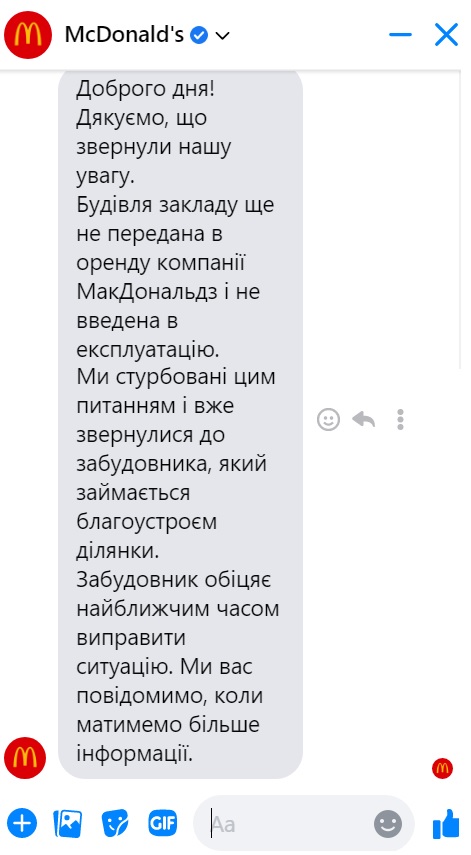 В комментарии ИзбирКому центр связей с общественностью McDonald's сообщил, что строение еще не сдали в эксплуатацию и не передали в аренду компании. При этом уточнили, что уже обратились к подрядчику, который занимался благоустройством этого участка.