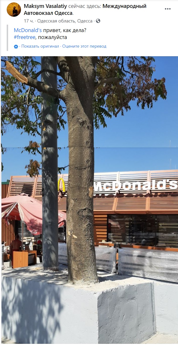 Дерево, росшее рядом с готовящимся к открытию кафе McDonald's в Одессе, оказалось замурованным в бетон.