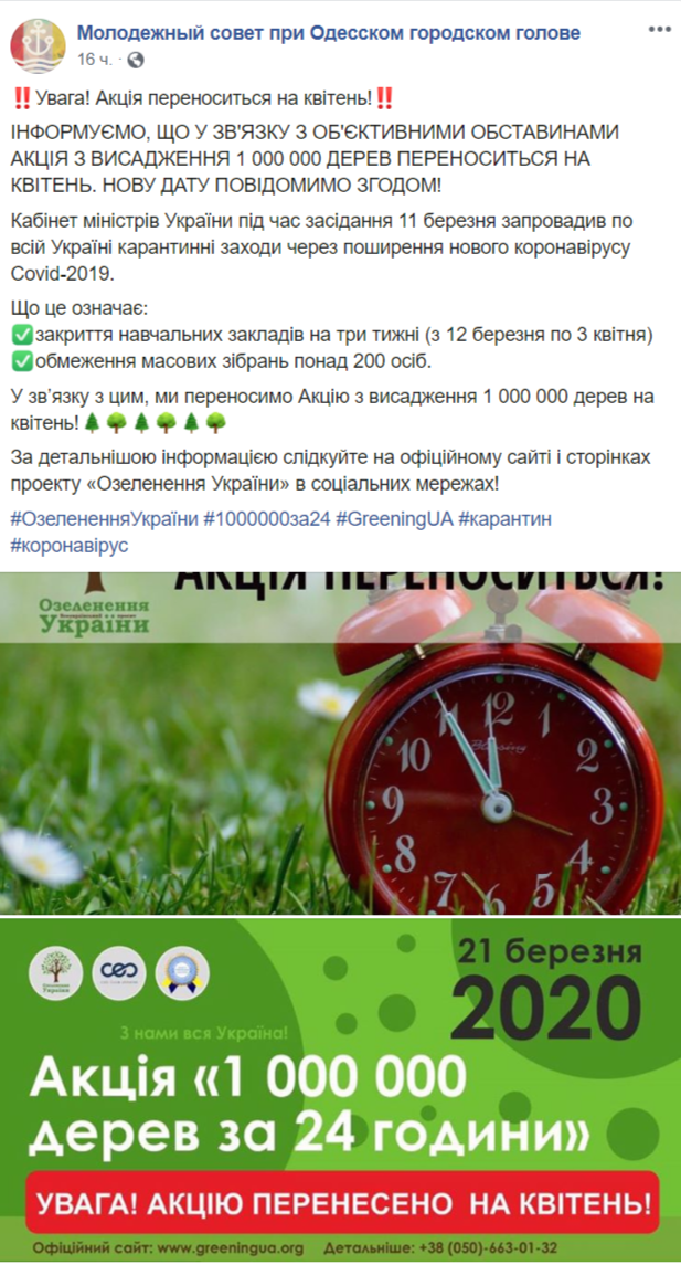Молодежный совет при Одесском городском голове сообщил о переносе акции по высадке в Украине одного миллиона деревьев за 24 часа на апрель, но пока не известно на какое число.
