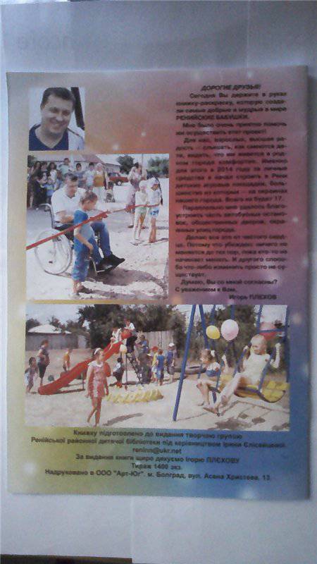 «Дорогие друзья! Сегодня вы держите в руках книжку-раскраску, которую создали самые добрые и мудрые в мире ренийские бабушки. Мне было очень приятно помочь им осуществить этот проект. Для нас, взрослых, высшая радость – слышать, как смеются дети, видеть, что им живется в родном городе комфортно. Именно для этого в 2014 году за личные средства я начал строить в Рени детские игровые площадки, большинство из которых – на окраинах нашего города. Всего их будет 17. Параллельно мне удалось благоустроить часть автобусных остановок, общественных дворов, окраинных улиц города. Делаю все это от чистого сердца. Потому что убежден: ничего не меняется до тех пор, пока кто-то не начинает менять. И другого способа что-либо изменить просто не существует. Думаю, вы со мной согласны? С уважением к вам, Игорь Плехов».