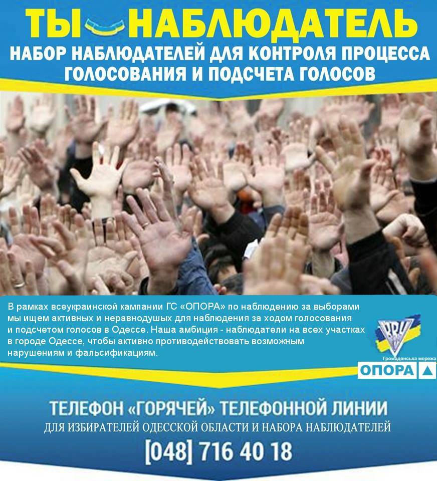 В рамках всеукраинской кампании ГС «ОПОРА» по наблюдению за местными выборами-2015 одесский КИУ ищет активных и неравнодушых одесситов для наблюдения за ходом голосования и подсчетом голосов в Одессе 25 октября