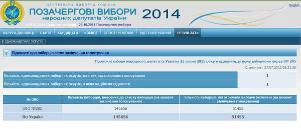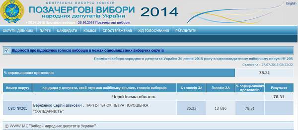 Кандидатом набравшим большее количество голосов в одномандатном округе №205 в Чернигове стал представитель партии «Блок Петра Порошенко «Солидарность»» Сергей Березенко