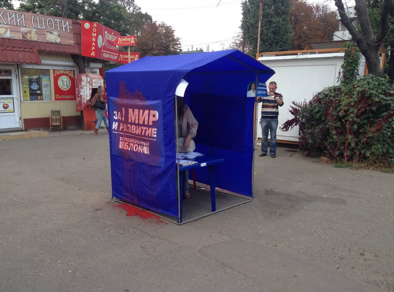 Партийные палатки этой силы уже подвергались атакам не только «Правого сектора» и «Самообороны», но и официальных властей. Так в Рени Одесской области палатки «Оппоблока» решили снести коммунальщики. Ранее же попытка политической силы начать агитацию до начала избирательной кампании привела к нападениям со стороны идеологических противников, а также к избиению журналиста, сделавшего агитаторам блока замечание, о незаконной агитации.