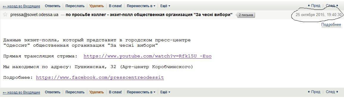 «Письмо» пришло в обычной рассылке пресс-службы мэрии. В нем содержится сообщение о том, что в пресс-центре «Одессит» организация «За честные выборы» представит данные экзит-пола. Между тем, законом запрещено сообщать какие-либо результаты экзит-пола до 20:00.