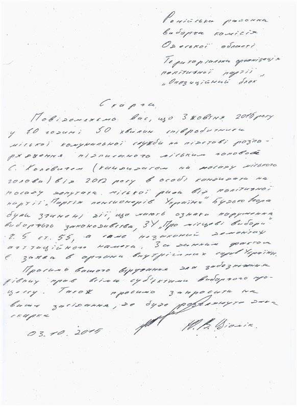 В субботу, 3 октября, в Ренийскую районную избирательную комиссию поступила жалоба от территориальной организации политической партии «Оппозиционный блок».