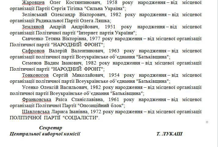 По данным сайта ЦИК, руководство областной избирательной комиссии разделят «Блок Петра Порошенко» - Ольга Горжеева, заместителем председателя будет Николай Губко, а секретарем комиссии будет представитель Радикальной партии Олега Ляшко – Сергей Узунов.