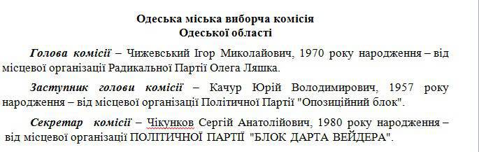 Его заместителем будет представитель «Оппозиционного блока» Юрий Качур, а секретарь комиссии – представитель партии «Блок Дарта Вейдера» – Сергей Чикунков.