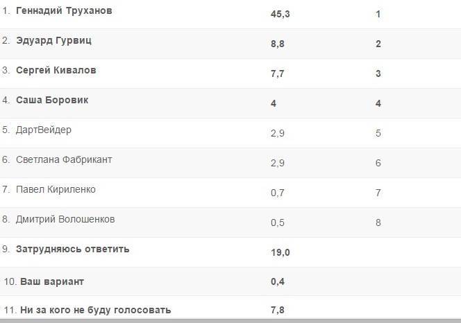 Согласно опросу, лидером оказался Геннадий Труханов, 45,3% избирателей отдали свои голоса за него. Второе место - за Эдуардом Гурвицом. Он, по данным опроса, набирает 8,8% голосов. Третий, с 7,7% голосов, депутат Верховной Рады Сергей Кивалов.