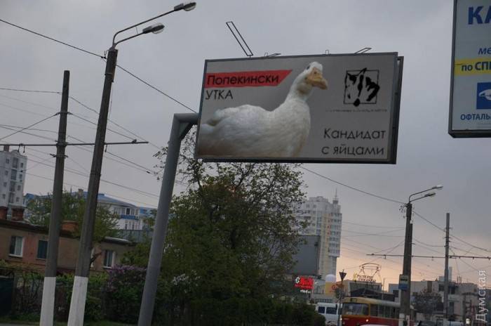 Дело в том, что этот «кандидат» не человек – это утка. Кандидат Утка Попекинский, конечно не зарегистрированный официально, но авторы идеи кроме видео в социальных сетях, даже повесили на улицах города бил-борды с изображением кандидата. Авторами идеи с кандидатом-уткой стали одесские журналисты, один из которых – Алексей Кравцов завел себе как-то утку в качестве домашнего животного.